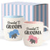 Set of two ceramic mugs with soft pink and blue interiors. Features playful elephant illustrations and the phrase “Promoted to Grandma” and “Promoted to Grandpa". Comes in a pastel striped gift box.