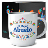 White ceramic mug with black rim and the phrase “El Mejor Abuelo” in bold blue lettering. Features a vibrant, traditional-inspired floral and bird pattern. Comes in a coordinating Spanish-themed gift box.