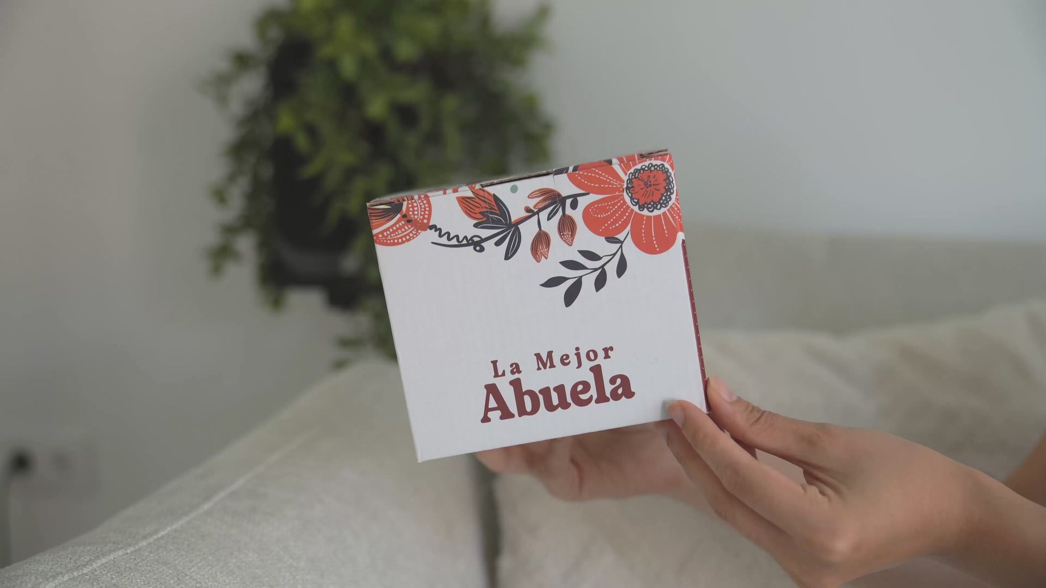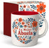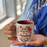 Ceramic mug with red interior and the phrase “La Mejor Abuela” framed by a heart-shaped floral pattern. Includes a matching gift box with coordinating colors and design. Microwave and dishwasher safe.
