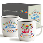 Set of two white ceramic mugs with black rims, featuring the phrases “El Mejor Abuelo” and “La Mejor Abuela” in Spanish. Both designs are decorated with colorful, traditional-style floral and bird motifs. Comes in a matching Spanish-themed gift box.