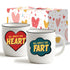 Set of two white ceramic mugs with playful graphics. One shows a red heart and the words “All About the Heart,” while the other features a cloud-shaped puff, humorously labeled “All About the Fart.”