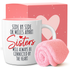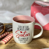 Ceramic mug with soft pink interior and the heartfelt message: “Side by side or miles apart, sisters will always be connected by the heart.” Includes a pair of soft pink socks. Packaged in a matching heart-themed gift box.