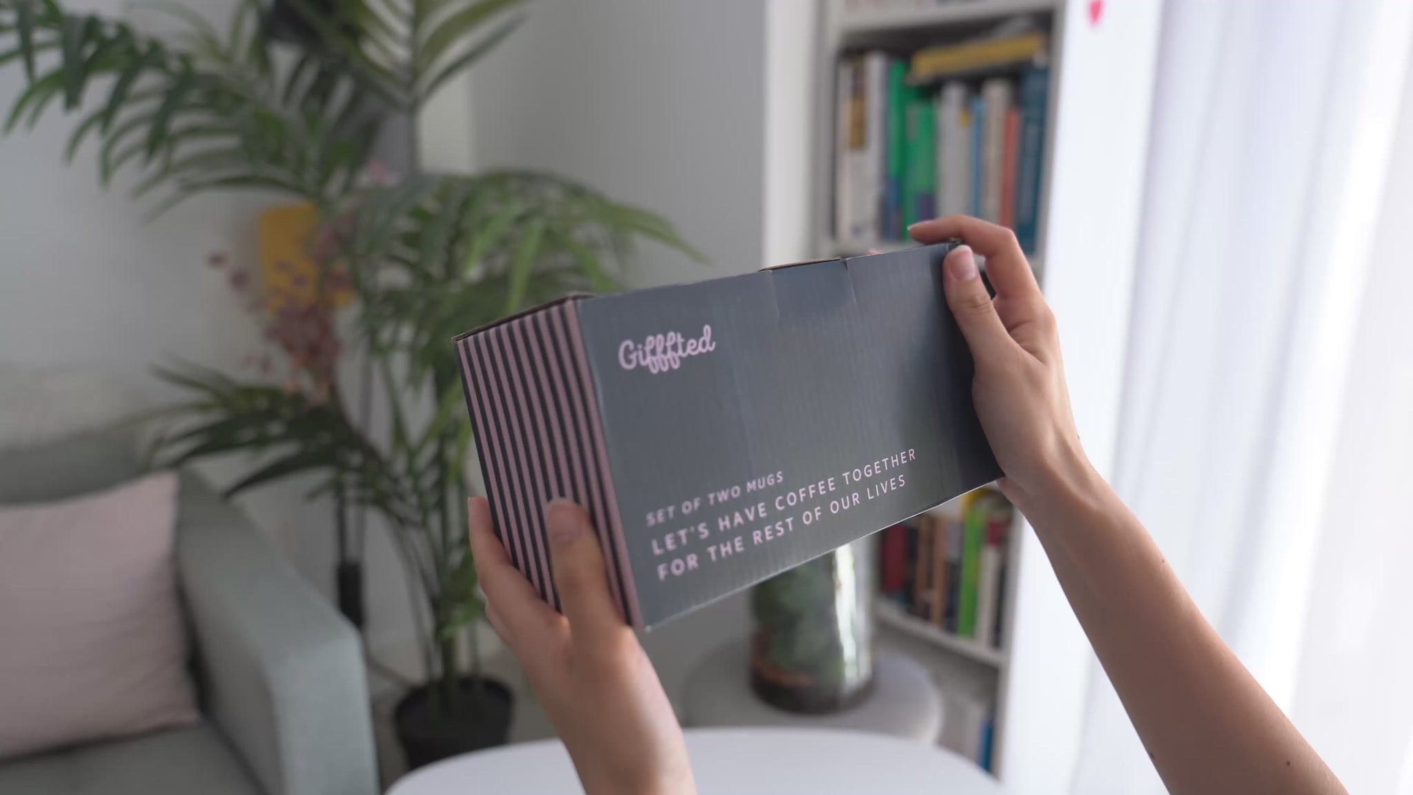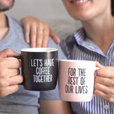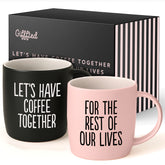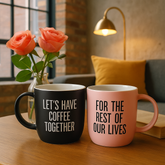 Set of two ceramic mugs: matte black with “Let’s Have Coffee Together” and soft pink with “For the Rest of Our Lives.” Modern typography with a romantic twist. Dishwasher and microwave safe. Comes in a matching gift box.