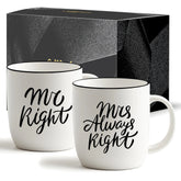 A pair of matching white mugs featuring "Mr. Right" and "Mrs. Always Right" in an elegant black handwriting font, adorned with a delicate black rim, beautifully packaged in a sleek black gift box.